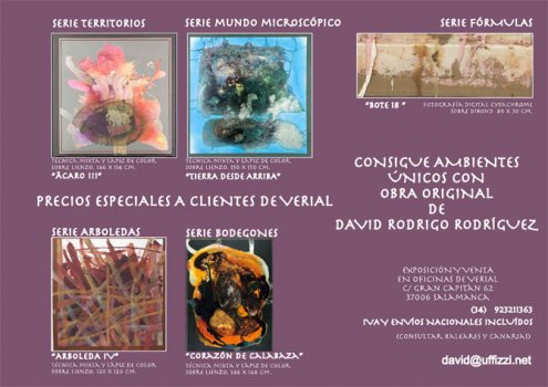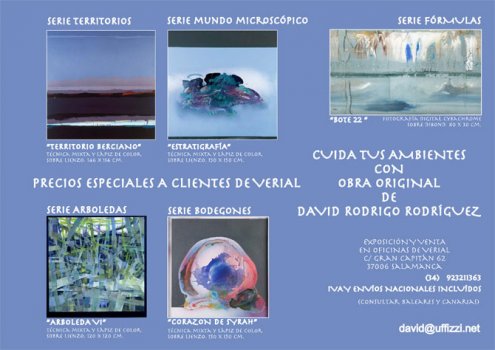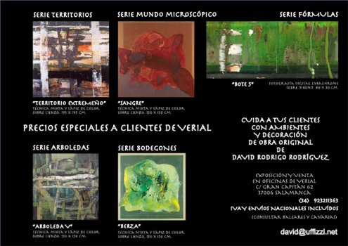 En colaboración con la empresa de gestión de software VERIAL SOFT, David Rodrigo RodrÃguez realiza su primera colaboración de venta y exposición en las Oficinas situadas en la C/ Gran Capitán nº 62, 37006 Salamanca, tfno. 923211363. Esta colaboración se apoya con la invitación a todo el público general y a todos los clientes, y especialmente a los de Verial, que disfrutarán de unas condiciones únicas para hacerse con obra original de nuestro pintor favorito. VisÃtanos!