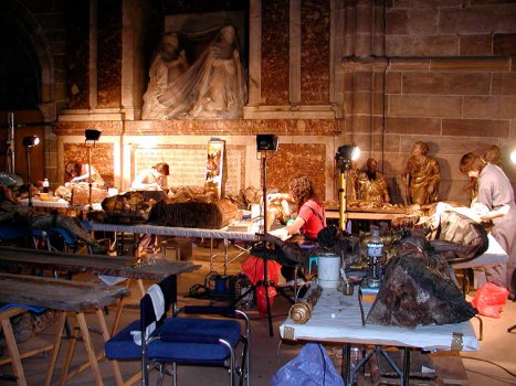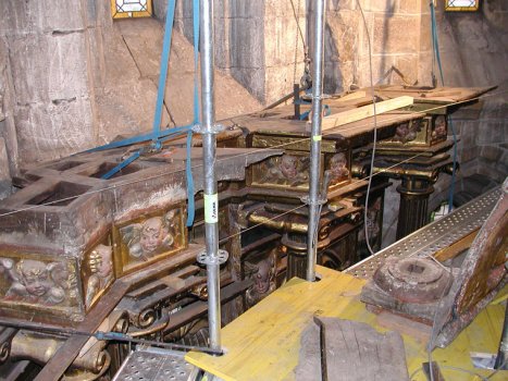 -Sujeción, consolidación mecánica y encolado de piezas en diversas zonas de la arquitectura y esculturas.