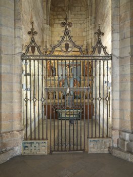 La reja gótica de hierro forjado y dorado que cierra esta capilla es de finales del siglo XV, con modificaciones de los siglos XIX y XX.
