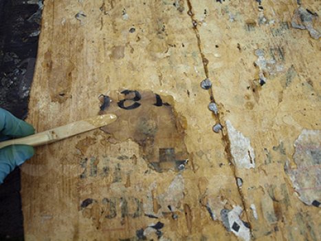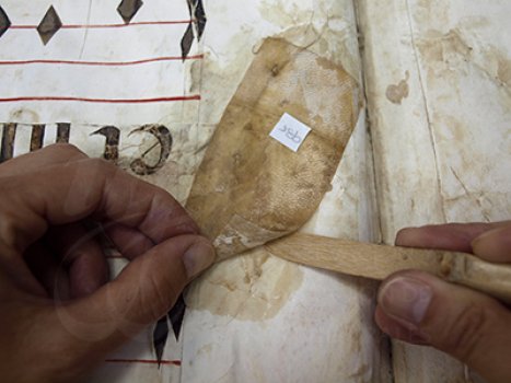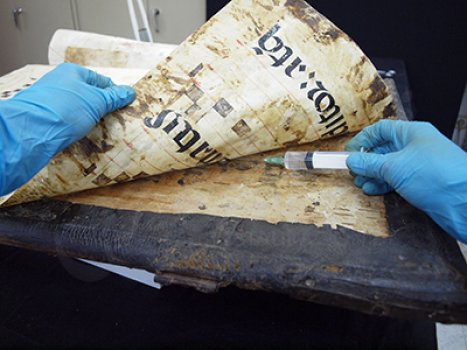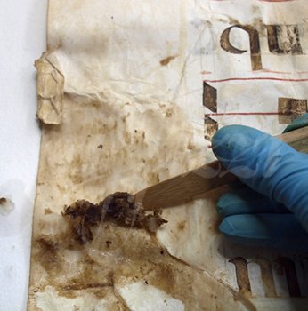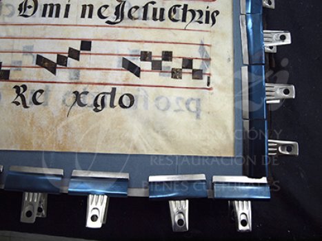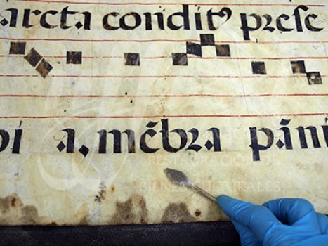 Una vez limpiado el documento, en una tercera fase se procedió a la fijación y consolidación de los elementos originales de la obra. Se afianzaron las tintas al pergamino mediante diversos adhesivos compatibles con el material de la obra. Por otra parte, se arreglaron las deformaciones del soporte y se procedió a realizar nuevos injertos para incorporar en las lagunas o desgarros de la obra que intentasen respetar las cualidades fÃsicas y quÃmicas del manuscrito original.