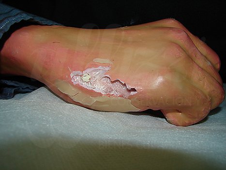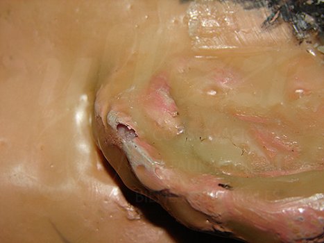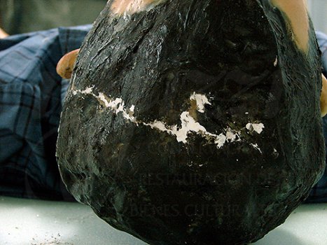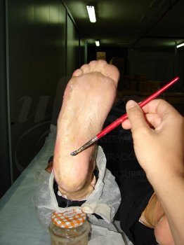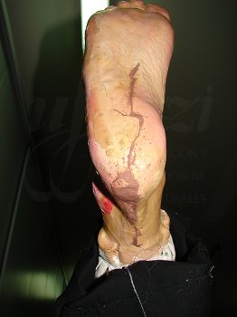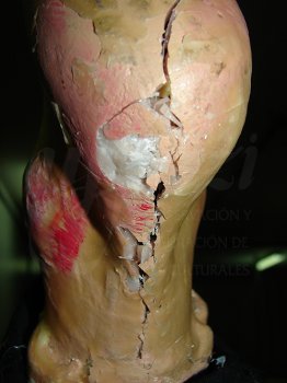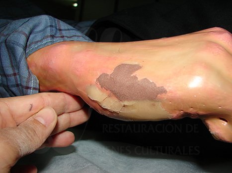 En la mano derecha se creó una fractura de la materia, asà como una pérdida y desaparición de la misma. En el talón apareció una grieta longitudinal de unos 22cm, encontrándose astillado en algunos de los restos de la resina de poliéster. En la cabeza también apareció una grieta, en este caso transversal. Y en la oreja izquierda se apreciaba una pérdida volumétrica.