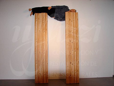 tela, madera, pintura, papel y cera. La escultura fue realizada en el año 2005.