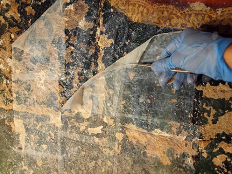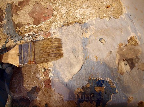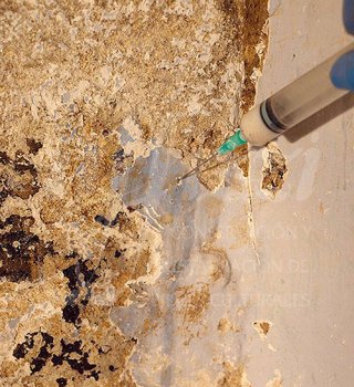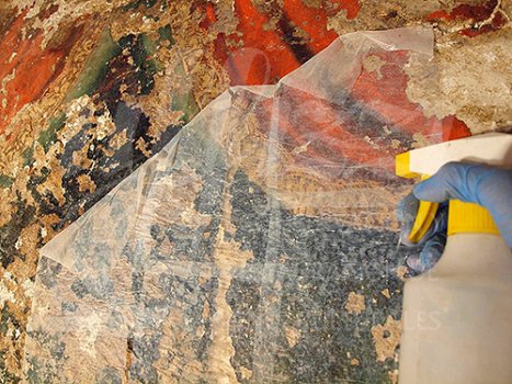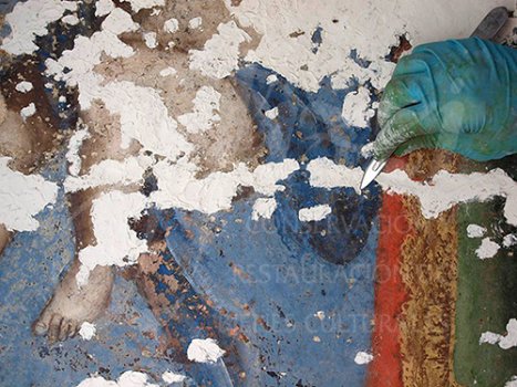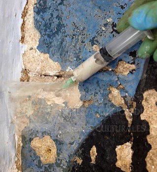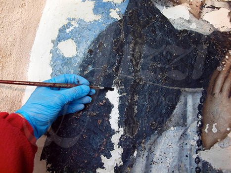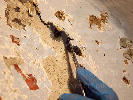 Para empezar, se realizó una fijación preventiva de la pintura mural sobre las zonas donde la policromÃa y la preparación presentaban cierto peligro de desprendimiento.