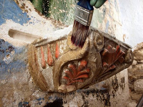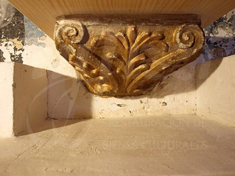 La limpieza de la pintura mural se realizó después de realizar una serie de test de solubilidad para establecer un protocolo adecuado de intervención. Para limpiar la ménsula se siguió la misma metodologÃa. Además, se reintegró soporte de las grietas y pérdidas de volumen, empleándose un mortero de cal y arena. Además, se estucaron las pequeñas lagunas del soporte.