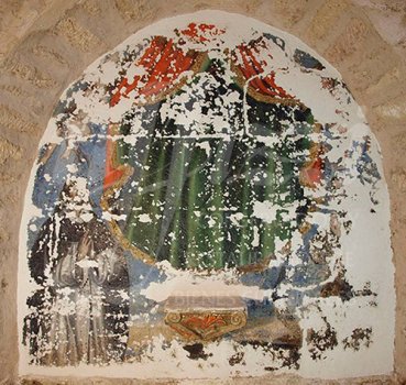 Como caracterÃstica se debe mencionar el recubrimiento de cal presente de forma generalizada. En las zonas más desafortunadas, se aprecia la total pérdida de la policromÃa y de la capa de preparación. Debido a la pérdida de policromÃa del estrato superficial, se puede apreciar la presencia de otra pintura subyacente. El criterio de intervención que se determino fue la conservación de la policromÃa superficial, debido a la imposibilidad de saber cuánto se podÃa recuperar de la pintura original subyacente, y por el buen estado que presentaba.