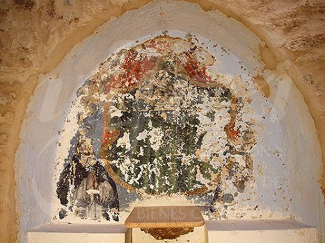 Después, se eliminó el estrato superficial de cal realizando una limpieza mecánica con bisturÃ. La capa de adobe que se encontraba ocultando parte del perÃmetro de la pintura se retiró utilizando cincel y martillo. La pintura se encontraba oculta en la zona inferior por unas gradas, por eso, se procedió a demolerlas, asà como, la superficie de la mesa de altar formada por baldosas de cerámica. También se eliminó la tabla de madera colocada encima de la peana de piedra.