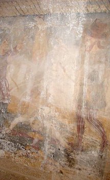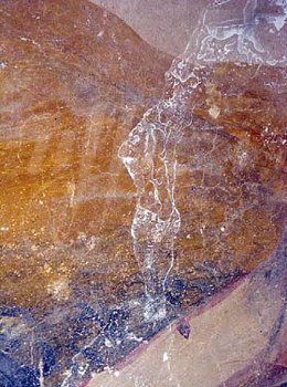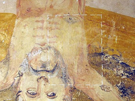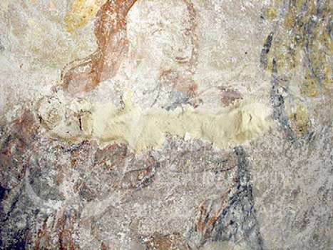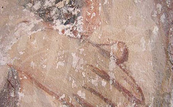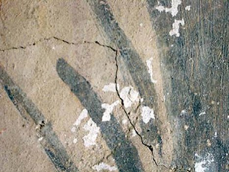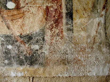mortero con policromÃa sobre la superficie de la pintura mural, pequeñas oquedades ocasionadas